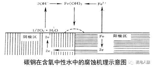 在阳极区,碳钢氧化生成亚铁离子进入水中,并在碳钢的金属基体上留下两个电子。与此同时,水中的溶解氧则在阴极区接受从阳极区流过来的两个电子,还原为OH-。两个去可以表示为: