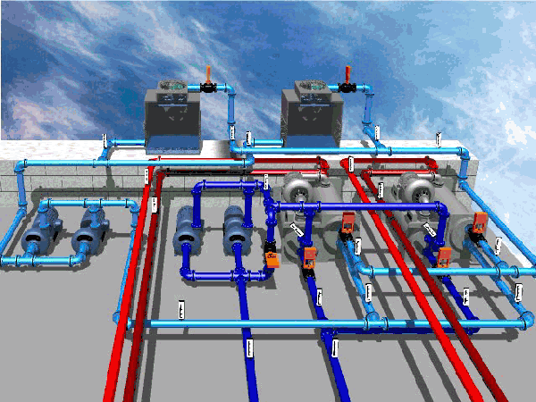 冷冻水循环系统:由冷冻泵及冷冻水管道组成。从冷水机组流出的冷冻水由冷冻泵加压送入冷冻水管道, 在个房间内进行热交换,带走房间内热量,是房间内的温度下降。