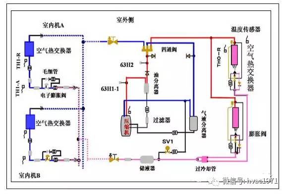 室内温度传感器控制室内机制冷剂管道上的电子膨胀阀,通过制冷剂压力的变化,对室外机的制冷压缩机进行变频调速控制或改变压缩机的运行台数、工作气缸数、节流阀开度等,使系统的制冷流量变化,达到制冷或制热2种方式随负荷变化而改变供冷量或供热量的目的。