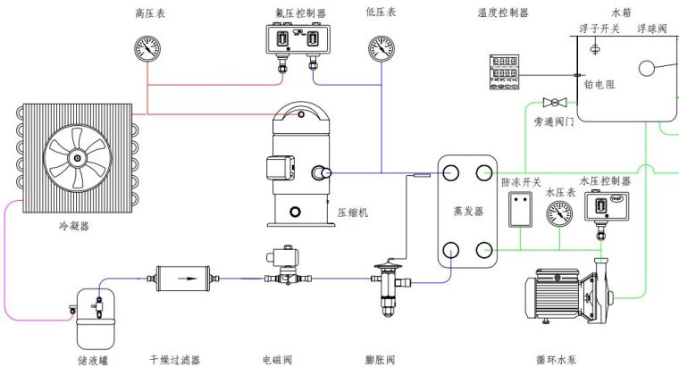 蒸发器中的液态制冷剂吸收水中的热量并开始蒸发,液态制冷剂亦完全蒸发变为气态后被压缩机吸入并压缩,气态制冷剂通过冷凝器吸收热量,凝结成液体,通过热力膨胀阀(或毛细管)节流后变成低温低压制冷剂进入蒸发器,完成制冷剂循环过程。