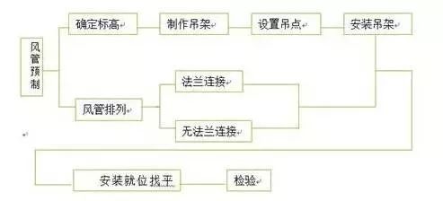 (3)支吊架安装前,按风管中心线找出吊杆敷设位置,单吊杆在风管的中心线上;双吊杆按托架的螺孔间距或风管的中心线对称安装。对风管管线较长,风管排列整齐的部位,安装支吊架时,先把两端的支吊架安好,再以两端的支吊架为基准,用拉线法找出中间支架的标高进行安装。同时,在适当位置设置防晃支架。