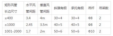 (4)支吊架不得安装在风口、阀门、检查孔等处,以免影响操作。吊架不得直接吊在风管法兰上。支吊架的间距按设计要求进行,每隔3米设支吊架一个,风管垂直安装时,间距不大于4m,但每根立管的固定件不少于2个。保温风管支吊架必须在横担上衬垫外刷防火漆的硬木垫,木垫的厚度以风管保温的厚度为准。