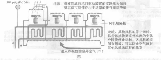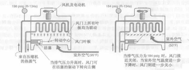 主要部件是百叶窗式风量控制装置。原理是利用高压制冷剂驱动的活塞式调节风门,这种控制装置可以和风机转速控制器一样活得稳定的排气压力;最主要的是膨胀阀的进口压力不会像风机间歇运行产生较大的波动。
