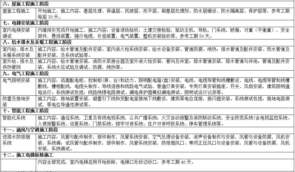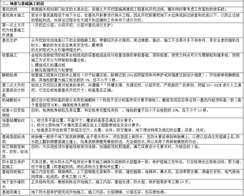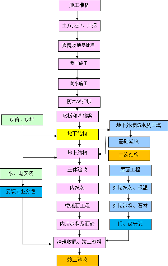 施工准备---建筑物定位放线---基槽开完---地基处理----立塔吊----垫层砼----基础钢筋---基础模板-----基础砼----地下室(钢筋模板砼)----主体升高----(地下室防水、回填)---主体升高---主体封顶-----二次结构(屋面工程穿插)------室内外装饰装修-----楼地面----门窗安装----水电安装----调试---竣工验收。