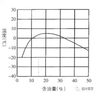 当冷媒为汽态时,润滑油夹杂在高压高速的气流中流动,当冷媒为液态时,润滑油混合在其中流动,为保证润滑油无论在冷媒处于何种状态都能很好的流动,不会产生滞淀,在选用润滑油时要求润滑油与冷媒有良好的互融性,下图是一类典型的润滑油与冷媒溶解曲线,在日常分析中带来不少便利。