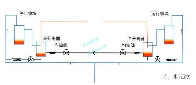 均油发生在多联机组中,同样,在系统中可以设计检测点,如油位等,当系统检测到某台压缩机贫油时,可以通过均油系统从富油的压缩压缩机系统中均衡部分润滑油给贫油压缩机系统,如果第二台压缩机也产生了贫油,通过检测重新开始一次均油,依次类推,直到所有压缩机系统油量均衡。