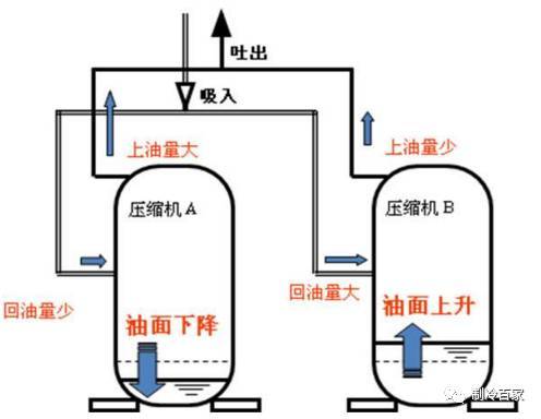 优化结构设计也有利于回油,目前常用的是汽油平衡技术。理论上各并联压缩机曲轴箱内的油压和气压均可以保证,但实际并不是很理想,由于平衡管的设计加工、机组安装、各压缩机的泵油量等因素影响,导致各压缩机曲轴箱的油压气压会高低不一,因此采用该回油方式,必须很好的从以上几方面控制,而且使用时不要超过三台压缩机。