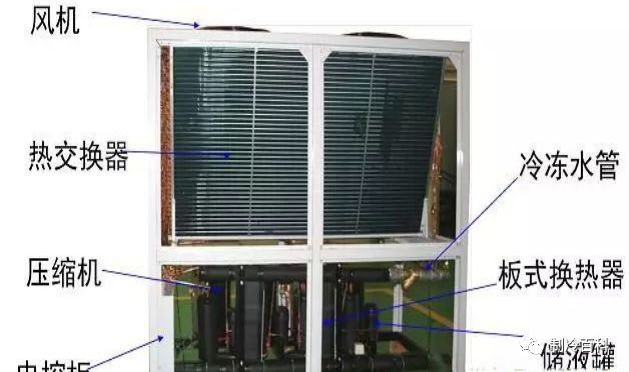 风冷模块机组是以空气为冷(热)源,以水为供冷(热)介质的 中央空调机组,即冷凝器为翅片式换热器,蒸发器为水氟换热应用的换热器,如套管、壳管及板式换热器等。