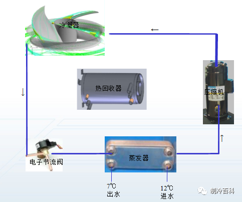 风冷热泵全热回收制冷:此时与普通风冷冷水机组一样使用,提供空调用冷冻水。制冷剂直接流入风冷冷凝器冷凝。