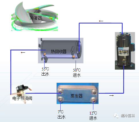 风冷热泵全热回收制冷+热回收:高温高压的制冷剂直接从压缩机至热回收器,机组在提供7℃冻水的同时又提供55℃生活热水。COP极高,最节能。
