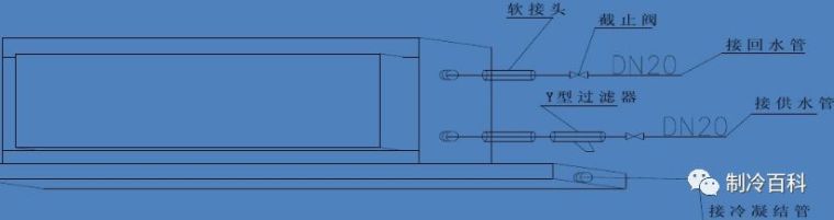3、风机盘管的供回水阀门、过滤器应靠近盘管安装,且全部在凝水盘的上方 。