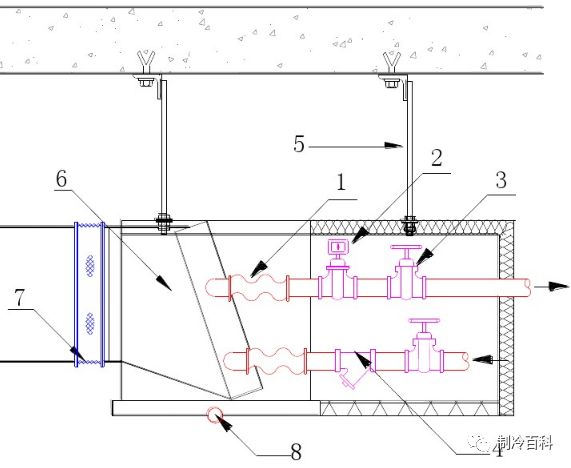 符号说明:1-软连接;2-电动二通阀;3-截止阀;4-Y型过滤器;5-吊杆;6-风机盘管;7-风管软接;8-凝结水排水 。