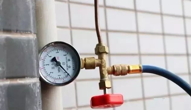 中央空调冷媒管内已经通入了40公斤氮气,呈高压状态。将填写好的空调保压卡挂至压力表处,方便之后进行检查。