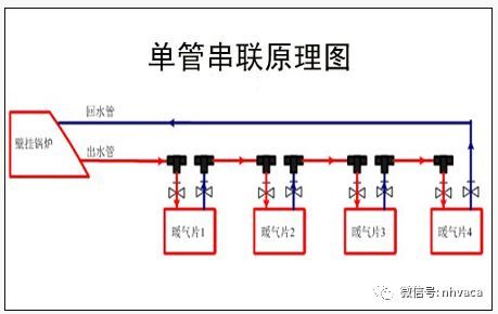 2、在暖气管线排列方式中,其单管串联是为常见的一种,整个系统的水是先经过系统的第一组暖气片,后是第二组,第三组.....为此水温是按照串联的顺序逐渐降低。