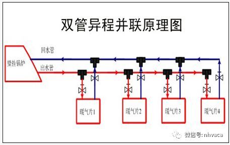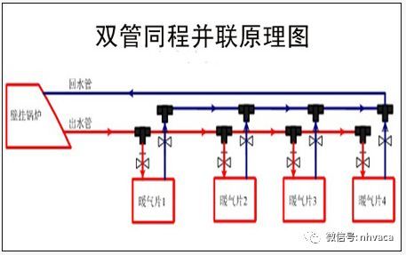 暖气管道安装采用双管同程并联方式,每组暖气片水流基本相同,整个系统水流平衡最佳,比较节约供热费和方便维修。