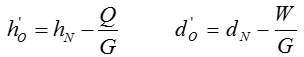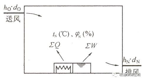 上图所示为一个空调房间的送风示意图。室内余热量(冷负荷)为Q(W),余湿量(湿负荷)为W(kg/s)。为了消除余热余湿,保持室内空气状态为N(hN , dN)点,送入G(kg/s)的空气量,其状态为O(ho , do)。送入的空气吸收室内的余热、余湿后,由状态O变为状态N而排出,从而保证了室内空气状态为N。