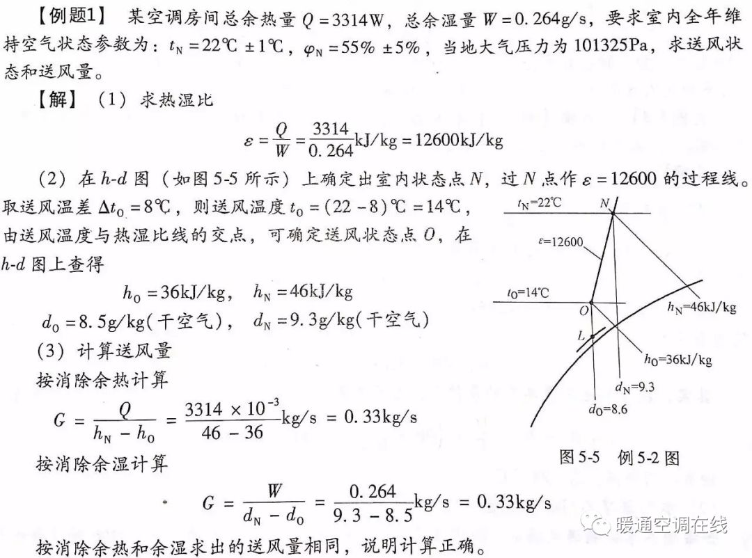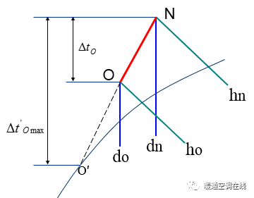 在焓湿图上就可利用热湿比的过程线来表示送入空气状态变化过程的方向。只要送风空气的状态点O位于通过室内状态点N的热湿比线上,那么将一定质量,具有这种状态的空气送入房间,就能同时吸收余热和余湿,从而保证室内要求的状态N。