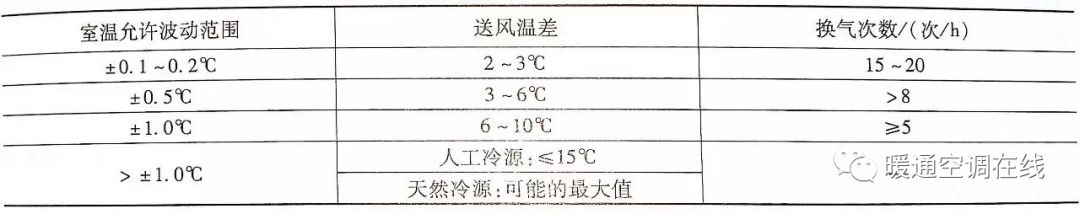 暖通空调规范根据空调房间恒温精度的要求给出了夏季送风温差的建议值,还推荐了换气次数,如下表所示。