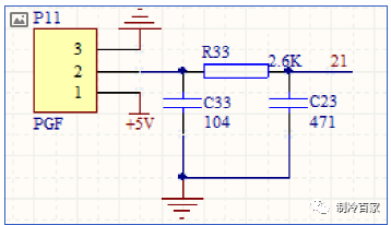 +5V 电源提供给电机内置风速检测电路使用,风机内置风速检测电路输出波形通过 R33 这个限流电阻后,通过 C33、C23 这个 2 个瓷片电容滤波,芯片通过对输入脉冲方波频率的检测,来判断风机的转速。