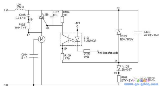 双向晶闸关V110,控制开关作用;电机M,带动室内风扇运转;电阻R102与电容C105,构成阻容保护电路,保护双向晶闸管又称双向可控硅,V110不受损坏;电容C104,风机分相启动;电感L101,滤波作用。