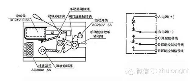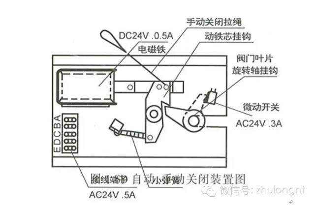 自动关闭:SD型自动、手动关闭装置是通过电磁铁的吸合动作来使阀门自动关闭。火灾时自动关闭装置接受烟(温)感器通过火灾控制盘输送来的电气信号(直流24V)或远距离操纵系统发来的电气信号(直流24V)后,电磁铁线圈通电,动铁芯吸合,使动铁芯挂钩与阀门叶片旋转轴挂钩脱开,阀门叶片受弹簧力作用而迅速关闭显示线接点,以供联动相关消防设务。SD型自动关闭装置又可用手动方式将阀门关闭。