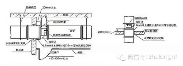 5.风管穿越防火区需安装防火阀时,阀门与防火墙之间的风管应用1.6mm以上的钢板制作,并用钢丝网水泥或其它非燃性材料保护。