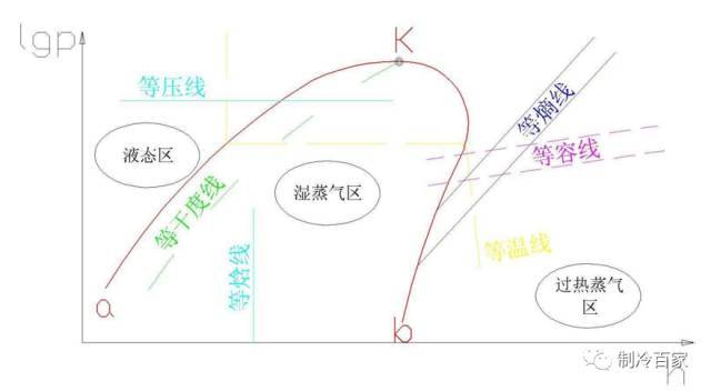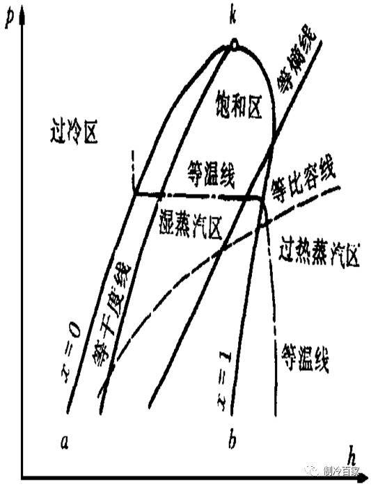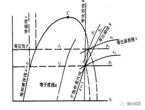 等温线(T):在过冷区内近于垂直h轴;在湿蒸汽区为水平线;在过热蒸汽区则弯曲下。