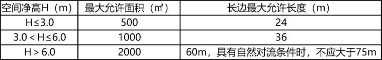 5. 公共建筑、工业建筑防烟分区的最大允许面积及其长边最大允许长度应符合下表规定,当工业建筑采用自然排烟系统时,其防烟分区的长边长度尚不应大于建筑内空间净高的8倍。