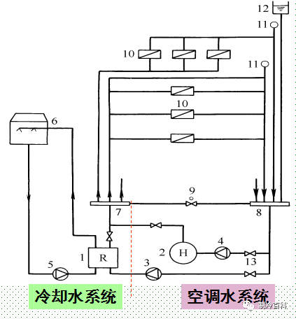 1-水冷冷水机组 ;2-锅炉 ;3-冷冻水泵 ;4-热水泵 ;5-冷却水泵 ;6-冷却塔 ;7-分水器;8-集水器 ;9-压差控制阀 ;10-空调设备 ;11-自动排气阀 ;12-膨胀水箱 ;13-阀门