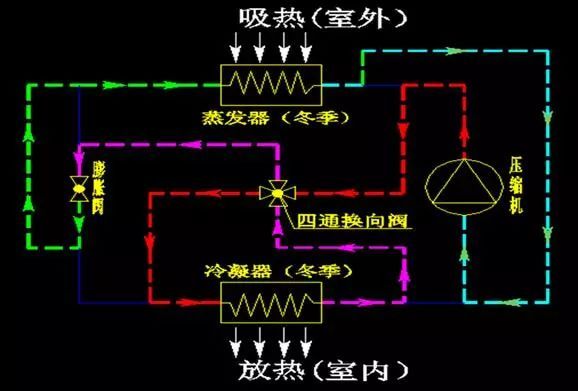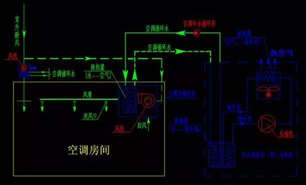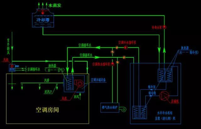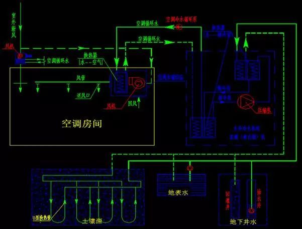 地源热泵系统基本原理同家用空调形式。差异是用冷却水冷却代替风冷冷却