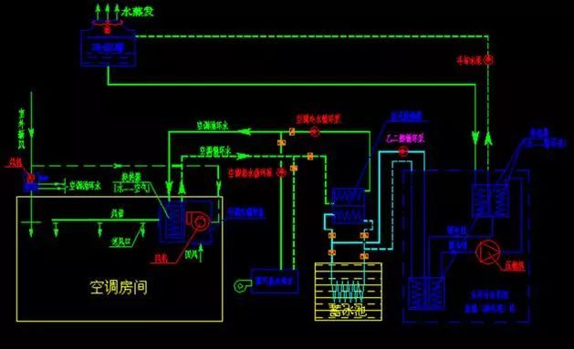 冷源:冷水机组;乙二醇循环泵;板式换热器;蓄冰槽;冷冻水循环泵,冷却水泵,冷却塔。