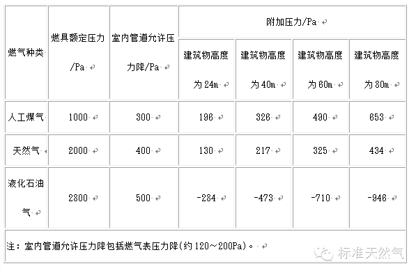 燃气种类 燃具额定压力/Pa 室内管道允许压力降/Pa 附加压力/Pa 建筑物高度为24m 建筑物高度为40m 建筑物高度为60m 建筑物高度为80m 人工煤气 1000 300 196 326 490 653 天然气 2000 400 130 217 325 434 液化石油气 2800 500 -284 -473 -710 -946 注:室内管道允许压力降包括燃气表压力降(约120~200Pa)。