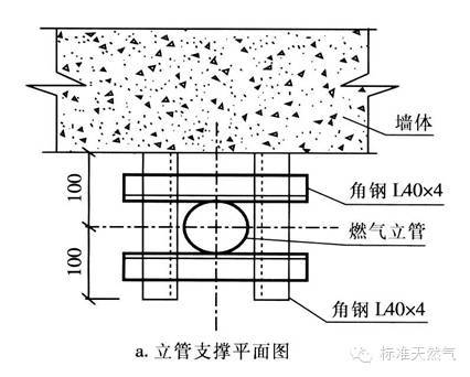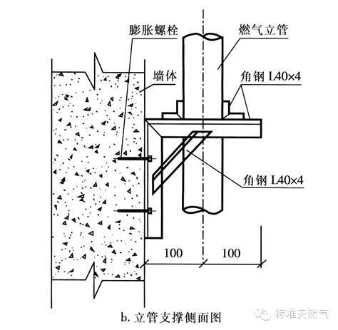 随着建筑物层数的增加,燃气立管的长度也变长,管道的自重变大,所以应设置管道的固定支架,使固定支架与建筑物成为一体,防止因管道下沉而引起引入管受力折断或变形引起倒坡。一般固定管道的做法有: