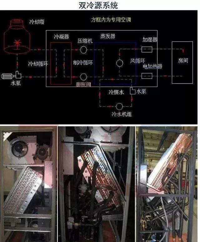 4、双冷源系统专用空调:由上述三种基本的冷却方式可组成不同类型的双冷源系统,如风冷+冷冻水系统、水冷+冷冻水系统。