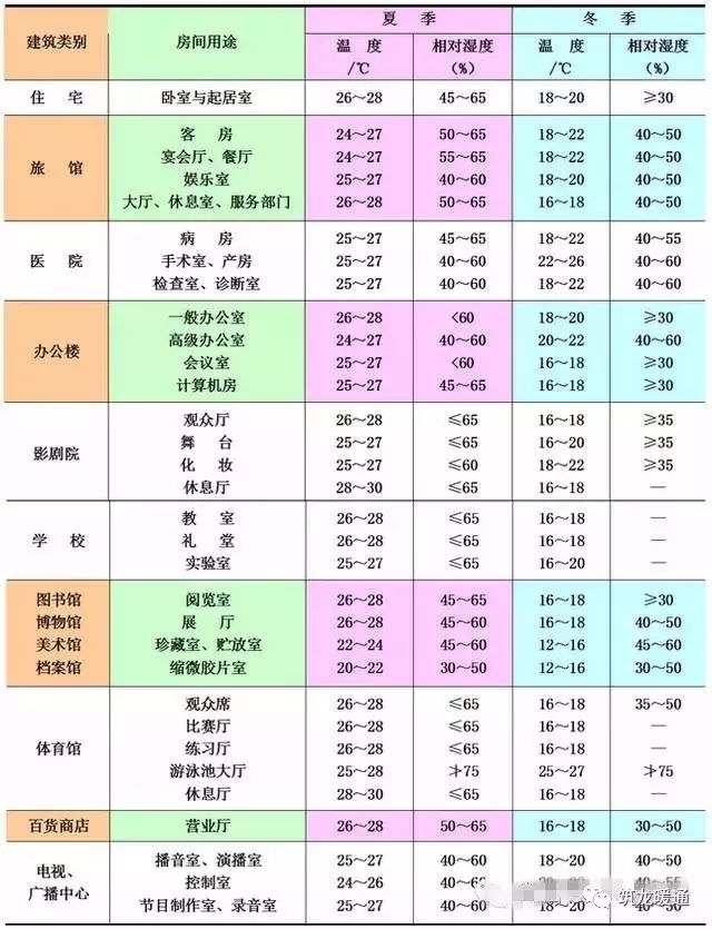 常见居住建筑与公共建筑内空调房间的室内空气参数