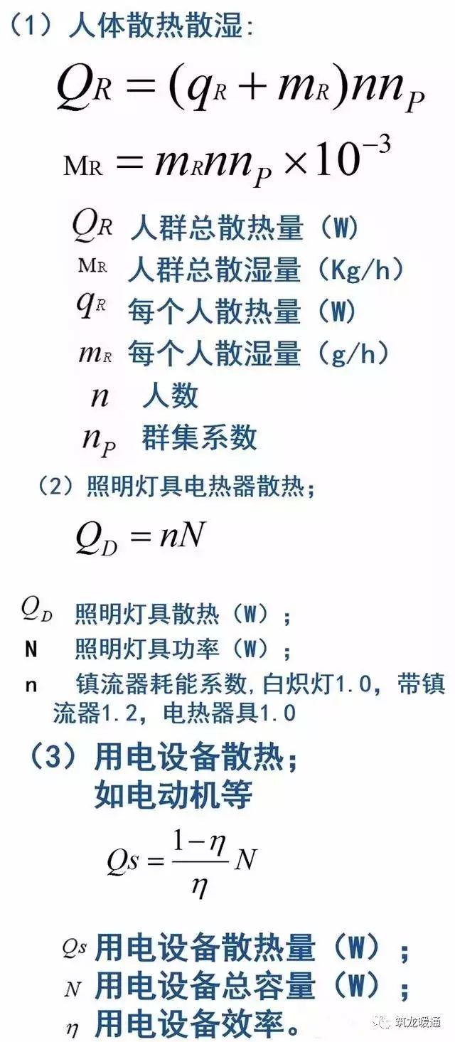 热负荷:维持一定室内热湿环境所需要在单位时间内向室内加进的热量。包括显热负荷和潜热负荷两个部分。如果只控制温度,而不控制湿度,则热负荷只包括显热负荷。空调室内热湿负荷主要来自: