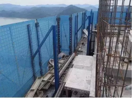 因为采用了铝模,混凝土浇注完成后K板未能拆除,导致最上面一道支座无处附着,从而影响爬架提升导致操作面高于防护。