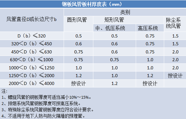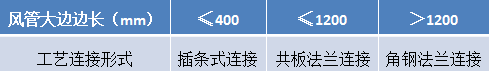 根据施工现场具体情况,采用角钢法兰、共板法兰和插条式连接三种工艺连接或者联合使用。工艺及风管边长划分、风管钢板厚度如下: