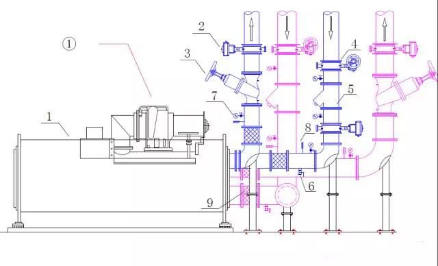 冷水机组常规接管图:1-冷水机组,2-电动阀,3-平衡阀,4-蝶阀,5-Y 型过滤器,6-泄水阀,7-压力表,8-温度计,9-软接头。