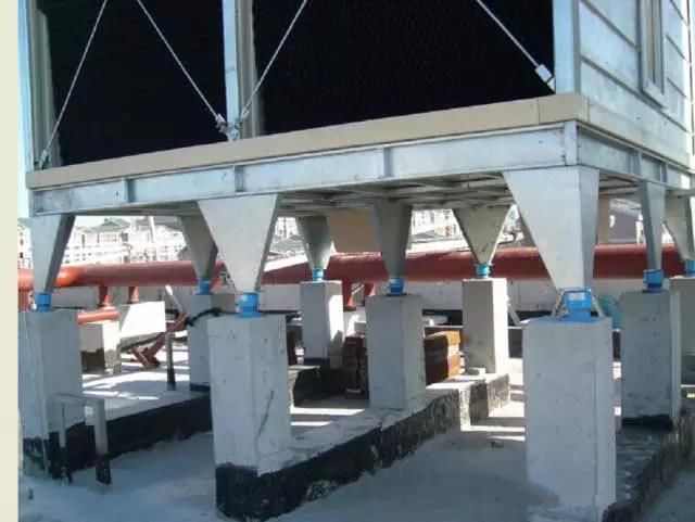 冷却塔基础尺寸标高、强度均应满足要求基础高度按管道安装要求而定。基础经过找平找正后安装减振装置,减震装置与设备及基础螺栓固定。