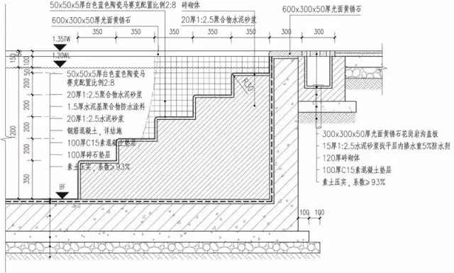 5、游泳池池底构造做法由上至下分别为:饰面材料、水泥砂浆结合层、防水层、水泥砂浆找平层、抗渗钢筋混凝土、混凝土垫层、稳定层及素土夯实;各层做法所用材料和强度可根据具体项目调整,池底需做变形缝,间隔一般为30m。