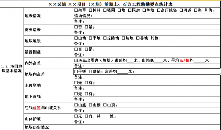 由于土地市场的狂热,为了能够让投资拓展小组人员能够快速而准确的对土石方工程完成踏勘,应针对此项工程制作专门的土方踏勘清单。