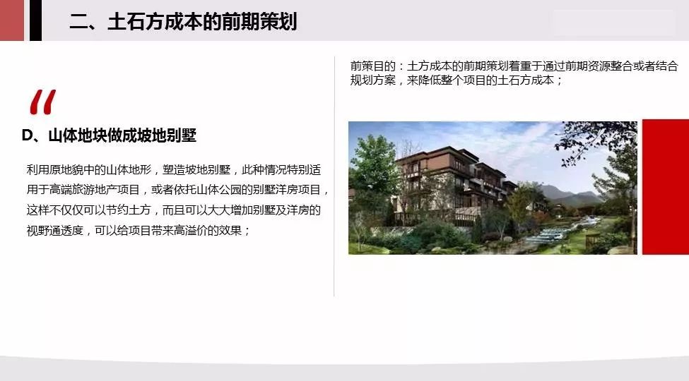 2.土石方的前期策划:调研土方稀缺情况相反的项目,土方富余可建议采用微地形,节地模式可大大节约土方成本,山体地块可做成坡地别墅;
