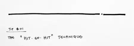 18年前,我从我的朋友Jon Kathol那儿学到了这个技术。当你在有目的地画一些图纸时,Hit-Go-Hit(中间停顿)技术能够帮助你从上一次停笔的地方开始接着绘图,并使图面变得更加自然。或许你会问,我为什么需要这个技术呢?对此,技巧2会更加详细地进行阐述,但是每当你要画一条直线的时候,(如果直线较长,)你通常会需要调整你的胳膊或者纸张的位置来方便自己将这条长直线画完。尽量使这个停顿看起来是有意的,并且通过这个Hit-Go-Hit(中间停顿)的技术为图面增添一些图形的修饰。