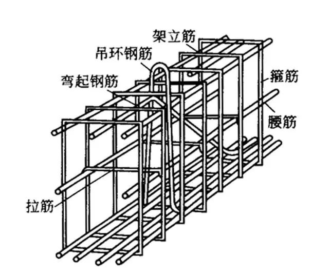 5、腰筋与拉筋。腰筋的作用是防止梁太高时,由于混凝土收缩和温度变形而产生的竖向裂缝,同时亦可加强钢筋骨架的刚度。