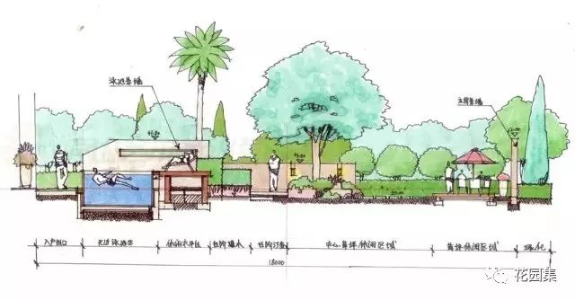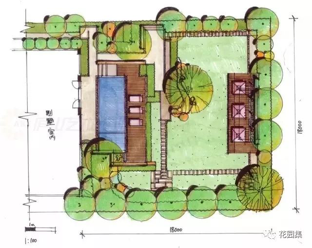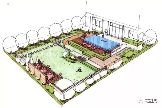 庭院空间手绘设计表达,这样类似的庭院空间在手绘设计表达上,首先注意交通组织的流畅舒适,抬高或下沉空间跟抬高面积的比例关系,做这样类似的设计时,在草图阶段要做到反复推敲空间组织的合理性,舒适性,空间关系的比例;