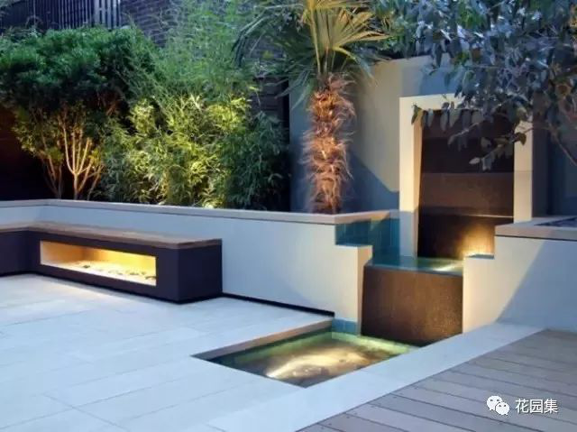 图中看到的景观墙体将原有的墙体层高做出错层的感觉,中间加入植物灯光水景等元素的运用,使得单调的景观墙也能成为一道亮眼的景观小品。