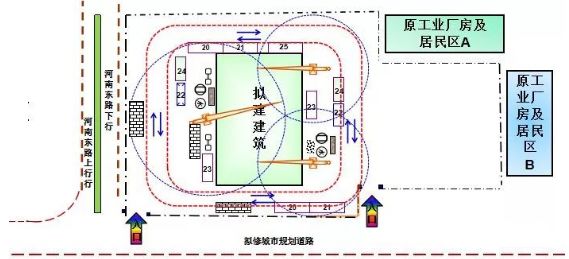 (2) 加工棚布置在建筑物四周。