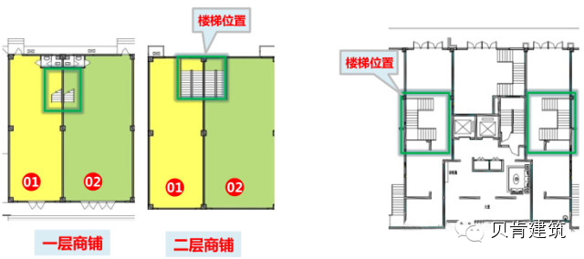 ◆ 针对一二层两梯商业、负一层与一层连体商业,在楼梯设计时,要尽量把楼梯贴墙、靠内部设计,尽可能不影响商业的经营空间。