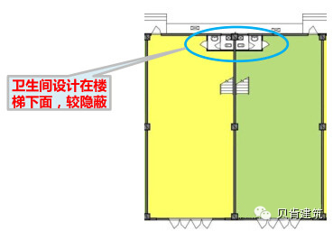 ◆同时为了把更好的一面展现出来,商铺卫生间的位置设计应相对隐蔽,如:楼梯的下面、最深处的角落里,既能够方便业主,又不影响商业环境。